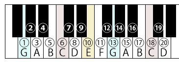 - 階名ソなので、早見表で見ると自分を入れないで数えて「7番目」の音、右に7つシフトということなので、鍵盤の図で数えて、日本の音名は「ト」と分かります。