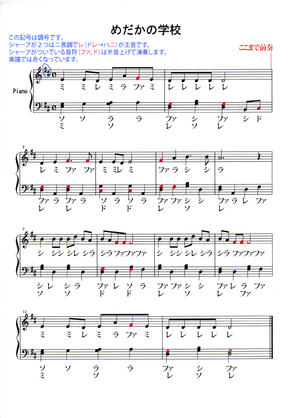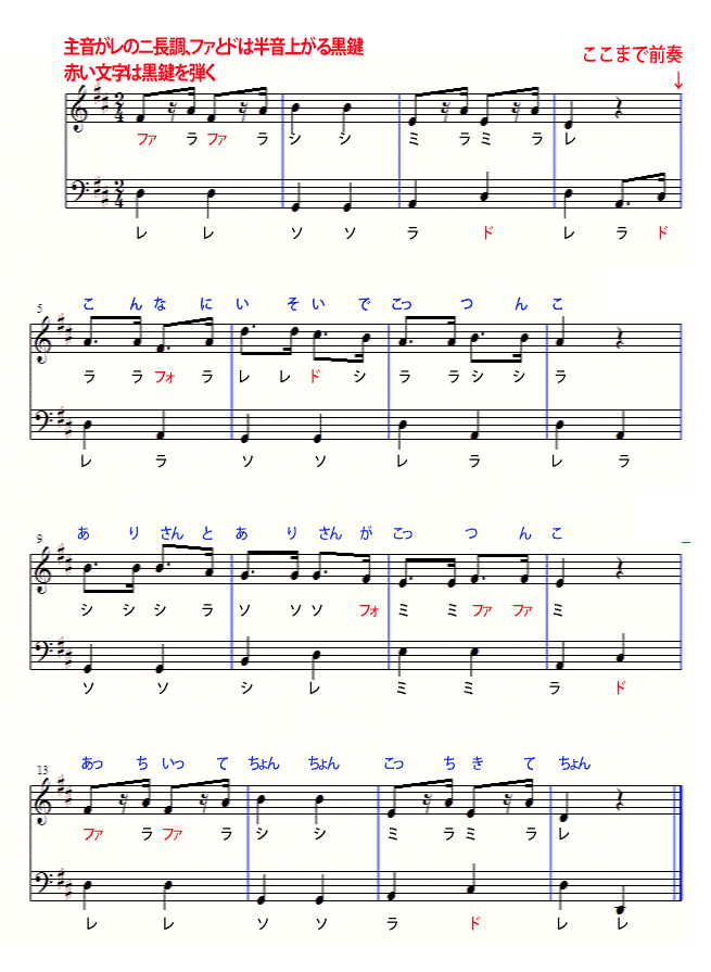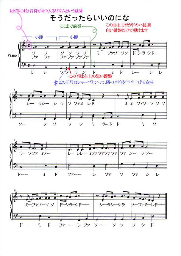 - 「ハ長調の」という所で、スタートの音が分かります。上の鍵盤の図を参考にして下さい。「ハ」=ドの場所がスタートです。